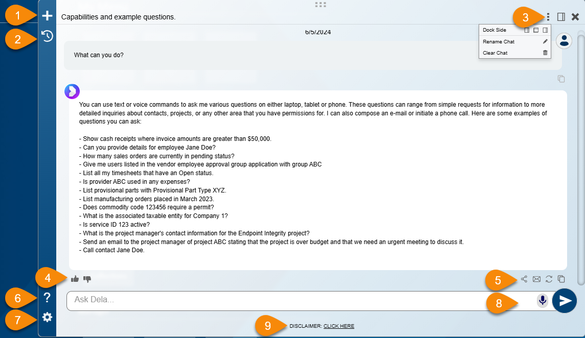 Features: (1) Start a new conversation. (2) Open chat history. (3) Change the chat window position, rename the automatically-generated subject titles, or delete the conversation. (4) Like or dislike responses to provide feedback. (5) Share, email, refresh, and copy responses. (6) Ask Dela to show sample questions you can ask. (7) Open settings to change the Ask Dela icon location and font size. (8) Use your voice to communicate with Ask Dela. (9) Show the legal disclaimer.